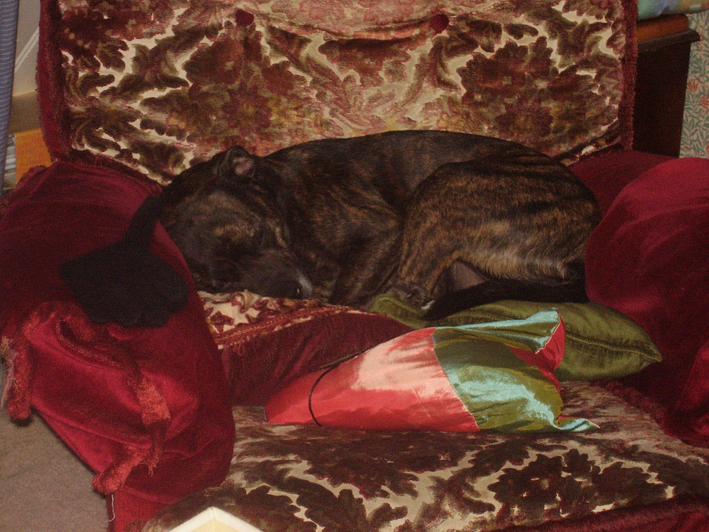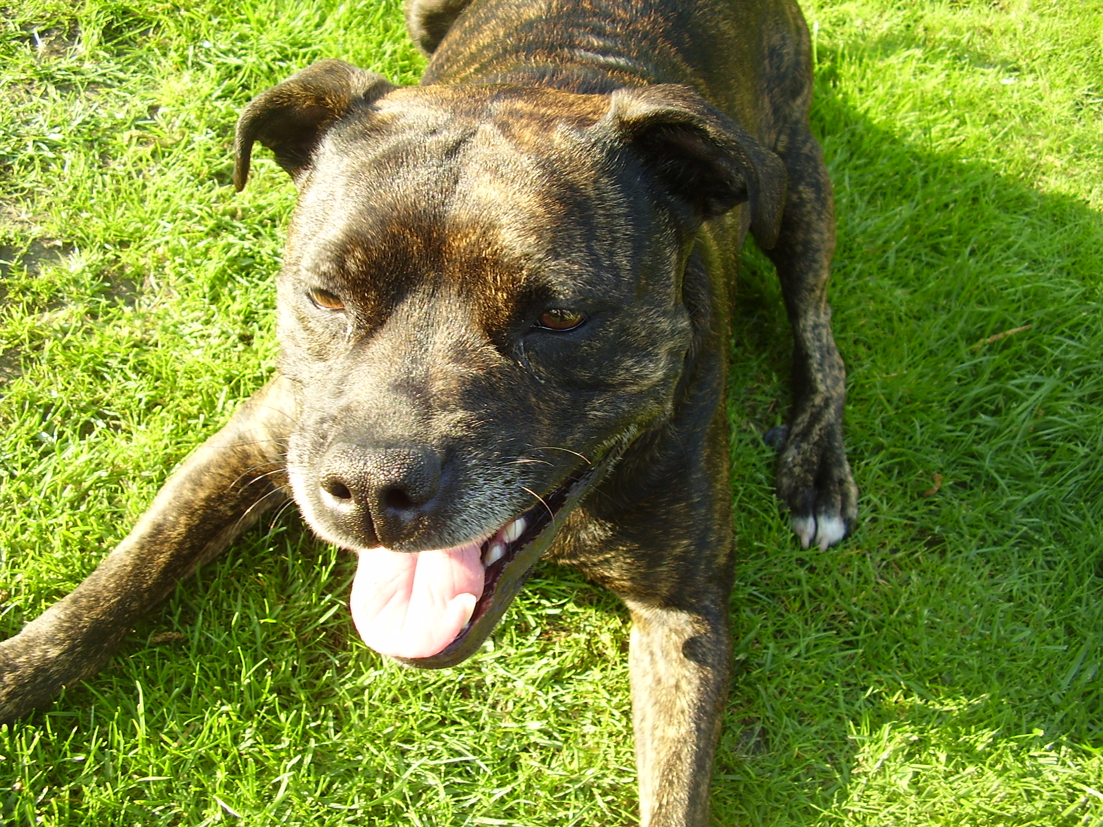 The moment I arrived I knew I had made the right choice; a puppy was definitely as good as a Playstation, if not better! The puppies were about four weeks old and were more enchanting than anything I had ever laid my eyes upon before. After some deliberation, watching the loose skinned, little animals eating and wobbling round me, I chose my puppy. The one I picked was a brindled (a sort of brown-black) bitch, she had various white patches on her chest, toes and small belly.