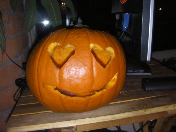 To celebrate, here’s the pumpkin I carved the other night for the UMHC pumpkin carving competition. I came second runner up (3rd), our of about 10, so obviously, I’m super chuffed at my l33t carving skillz. 😉