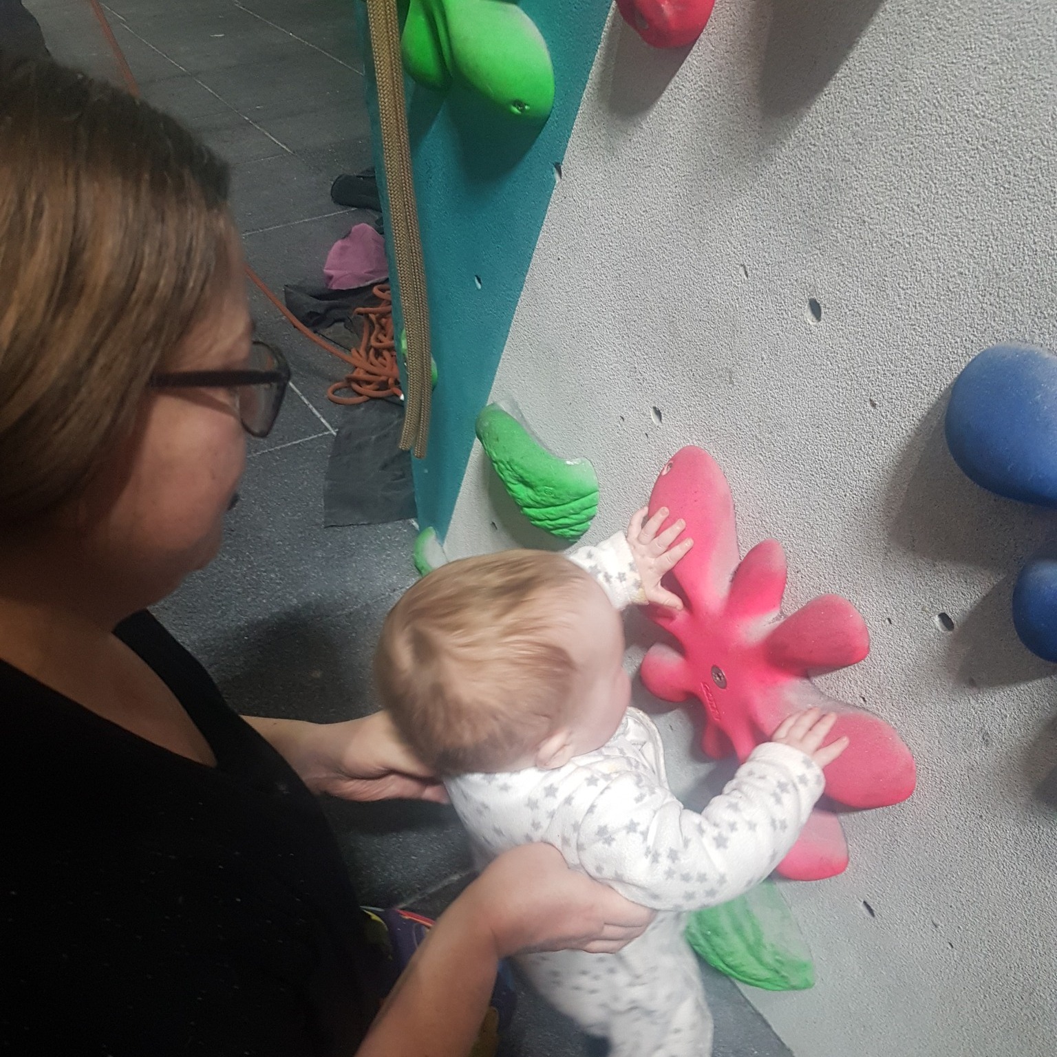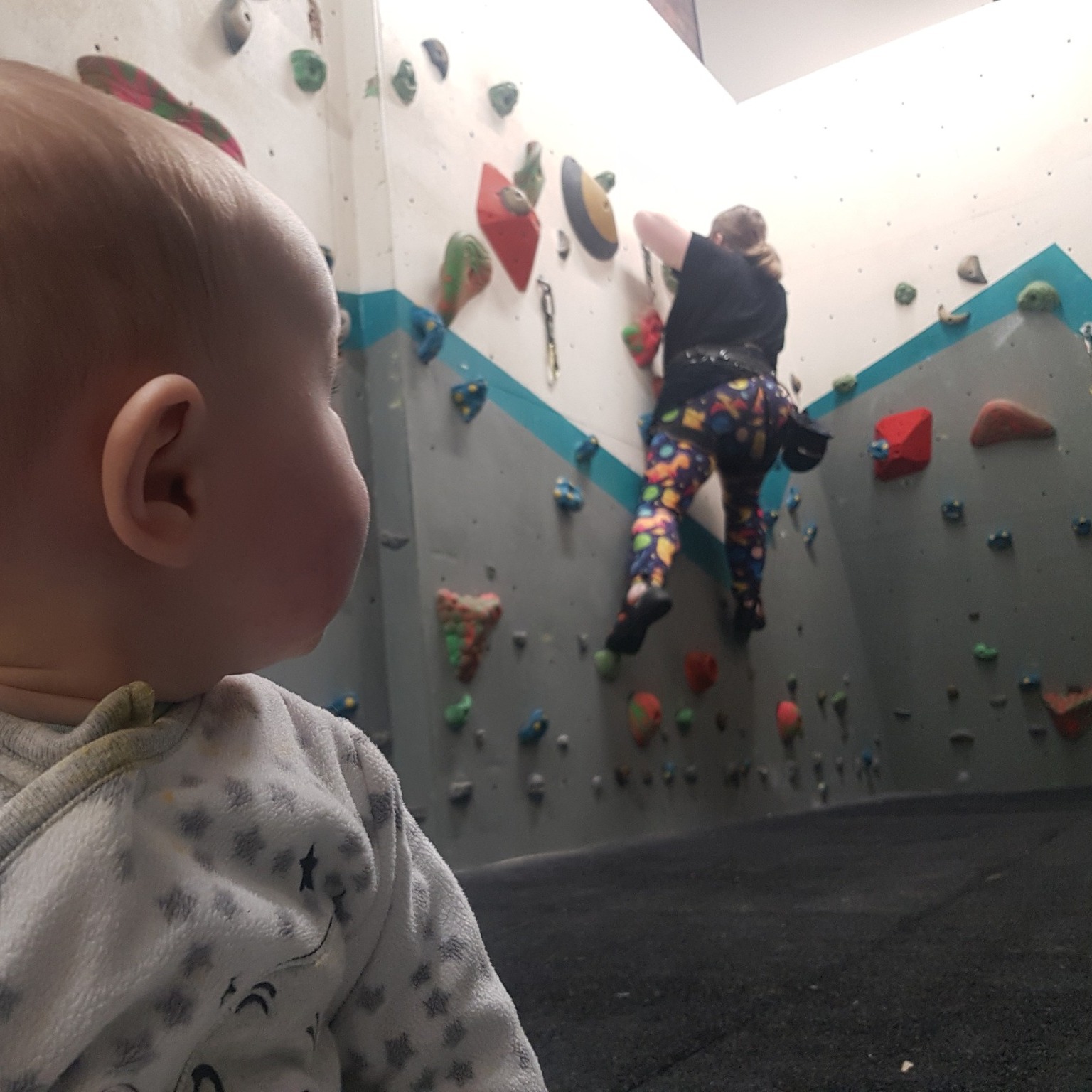 The challenge is that realistically, you are only well placed to support your child climbing, and if they’re a baby, they ain’t going up yet! Even with a 2:1 parent/baby ratio, you’re still going to struggle to get any climbs in without a third person.
