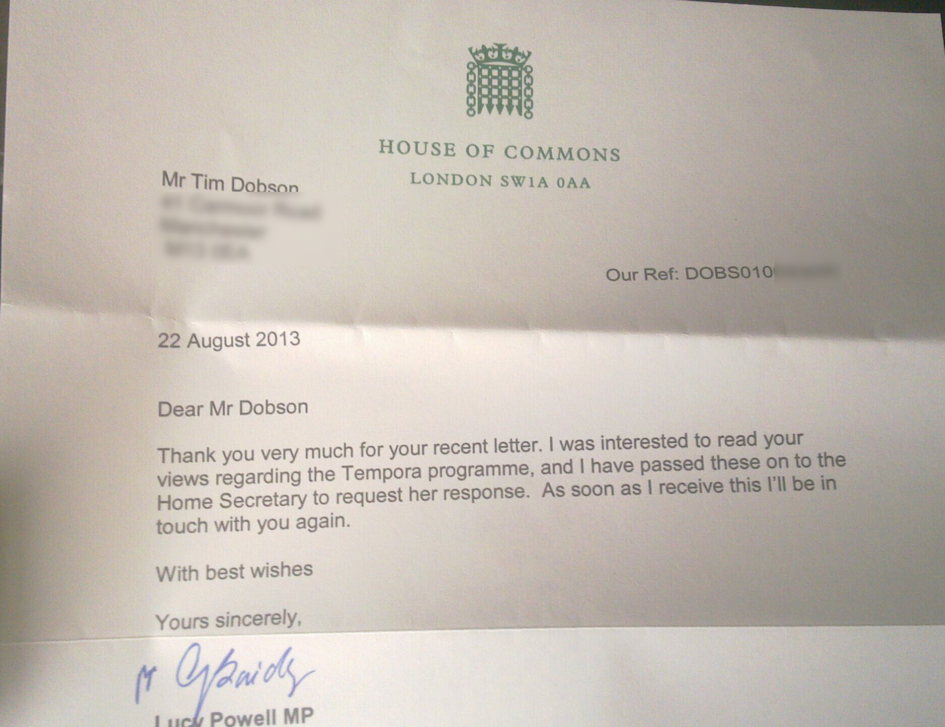 On the 5th of August I wrote to my MP about Tempora.
