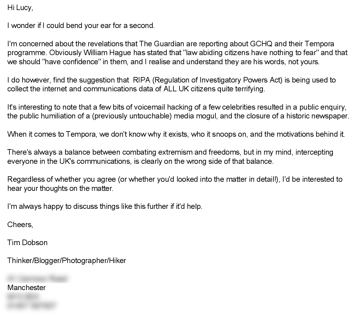 I’ve had to blank it out partially, but I now have a reference number, and this reference number means that, rather than simply sitting and waiting for Lucy to hand me a form-letter from Teresa May’s summer intern, about why “GCHQ is important for our national security” and we must “prevent terrorists and think of the children”, what the reference number means, is that I can write back and engage Lucy in the issue more.