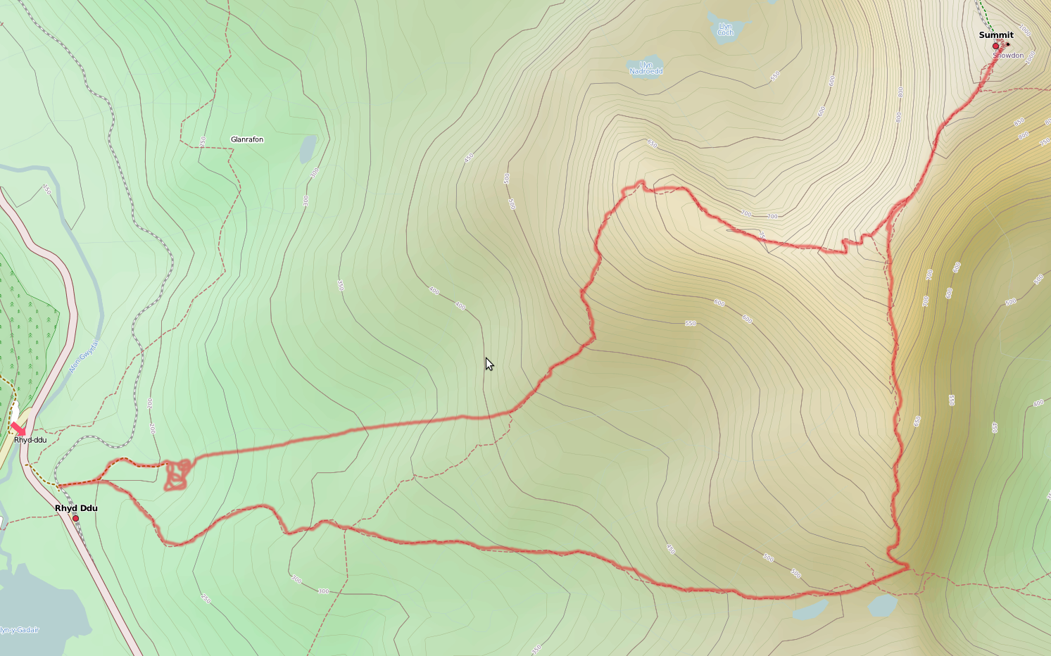 We ascended from the Rhyd Ddu side up a relatively unnamed path (according to the map) and returned, largely, via the “Rhyd Ddu” path..